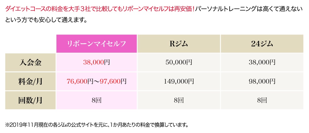 パーソナルトレーニングは、価格が高いイメージがありますが、リボーンマイセルフは、そのようなことはありません。月に8回通っても10万円を超えることはありません。
